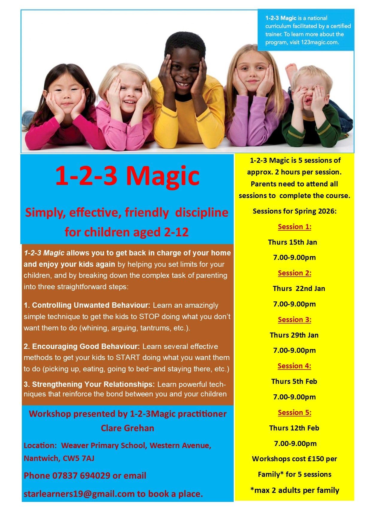 We are able to offer the 123 Magic programme to support parents who are finding their child's behaviour challenging. This simple, effective and friendly discipline programme will enable parents to gain control back into their household and help to forge a better relationship with their child.